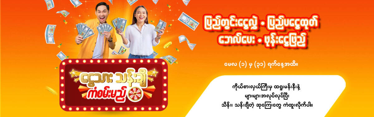 ၁) ကိုယ်စားလှယ်ကြီးများအတွက် “ငွေသား၊ သန်းချီ၊ ကံစမ်းမည်” ကံစမ်းမဲ အစီအစဥ်သည် ပြည်တွင်းငွေလွှဲ၊ ပြည်ပငွေထုတ်၊ ဘေလ်ပေး၊ ‌ဖုန်းငွေဖြည့် ကြိုက်နှစ်သက်ရာ မည်သည့် ထရူးမန်းနီး ဝန်ဆောင်မှုကို (၅) သောင်းကျပ်နှင့်အထက် ဆောင်ရွက်ပြီးစီးတိုင်း ‌ငွေသားဆုကြေးများစွာ ကံထူးနိုင်မယ့် ကံစမ်းမဲလက်မှတ် (၁) စောင်ရရှိမှာဖြစ်ပါတယ်။