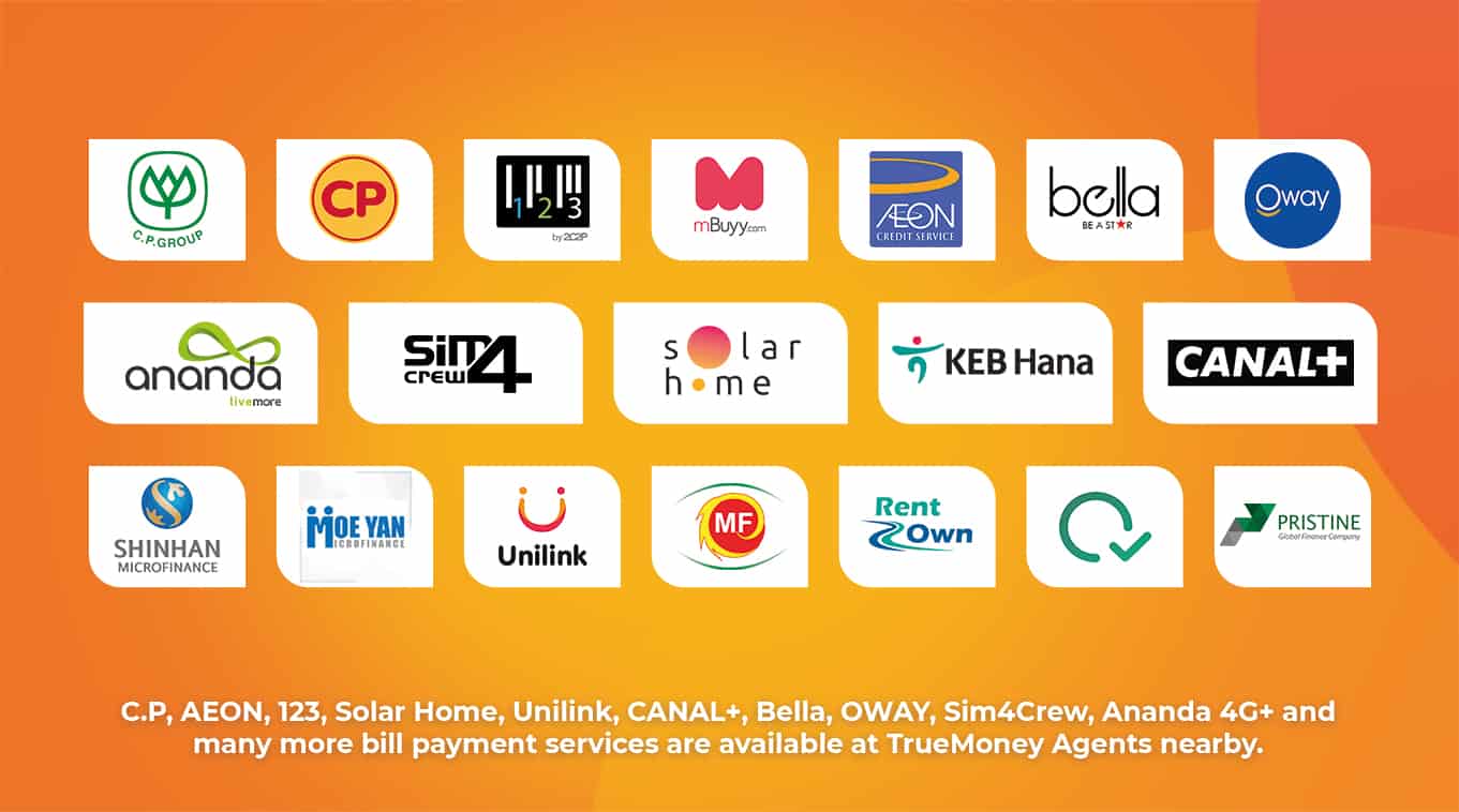 Airtime Topup service is available at TrueMoney Myanmar. CP, 123 Payment, AEON, Oway, Ananda, CANAL+ and many other Bill Payment services can be billed or top-up via TrueMoney.