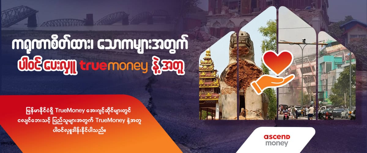 TrueMoney Myanmar မှ TrueMoney Thailand၊ TrueMoney Cambodia တို့နဲ့ ပူးပေါင်းပြီး မတည်ငွေ ထိုင်းဘတ် ၁ သန်း နဲ့အတူ လှူဒါန်းရရှိငွေ စုစုပေါင်းကို ငလျင်ဘေးသင့်မြေပြင်ဒေသများအတွက် တိုက်ရိုက် ပံ့ပိုးကူညီနေသော နိုင်ငံတကာအဖွဲ့အစည်းများနှင့် ဒေသတွင်း အဖွဲ့အစည်းများမှတဆင့် ငလျင်ဘေးသင့် ဒေသများအတွက် ခွဲဝေ လှူဒါန်းပေးသွားမှာဖြစ်ပါတယ်။